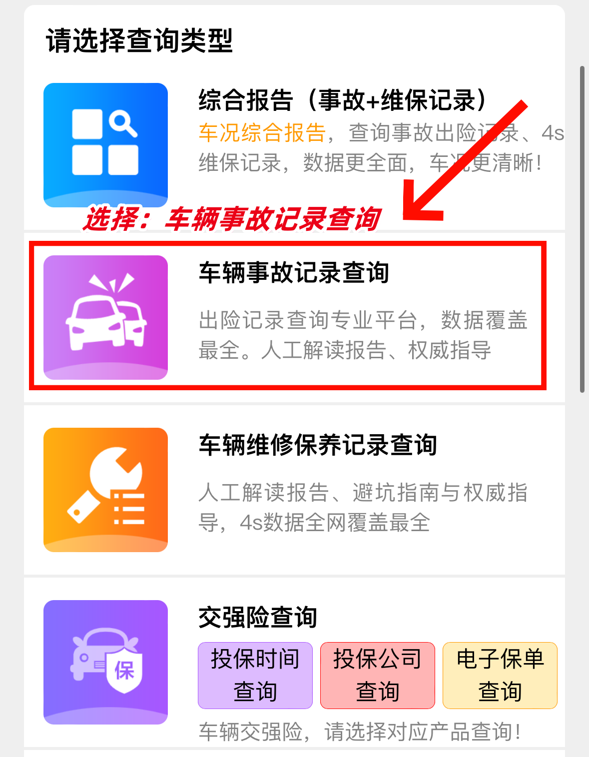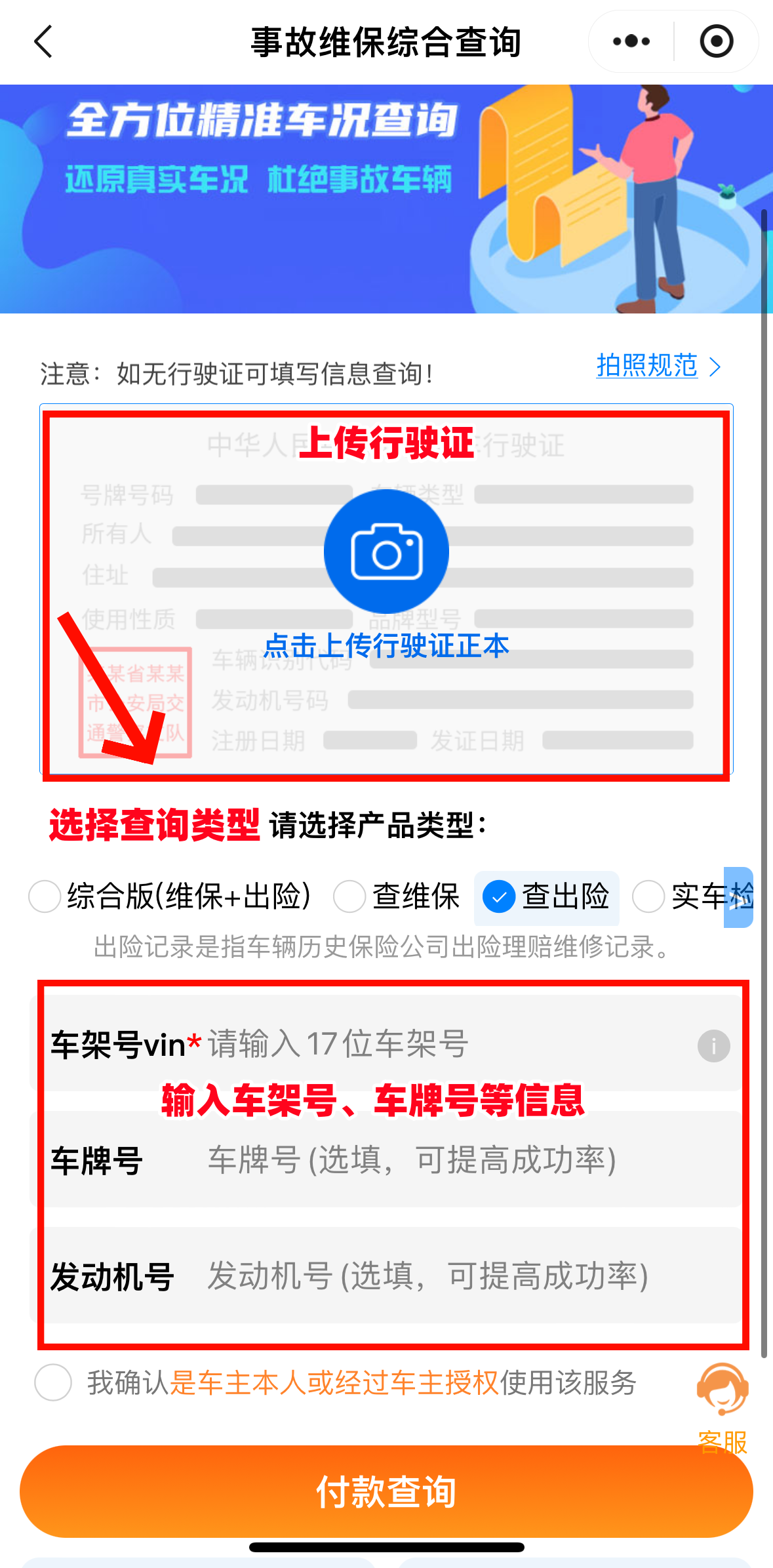 ③查询类型选择:“查出险”,然后根据提示上传行驶证或输入车架号、车牌号等信息点击付费查询即可