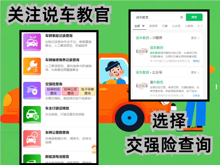 ②公众号查询:公众号查询汽车交强险投保公司方法分享,手机打开后,随便关注一下公众号例如【鉴车教官】,打开后选择交强险查询。里面根据查询结果不同,又细分为电子保单查询,投保公司查询,投保时间查询。注意不要选错哦,选好后根据提示输入车辆信息即可。
