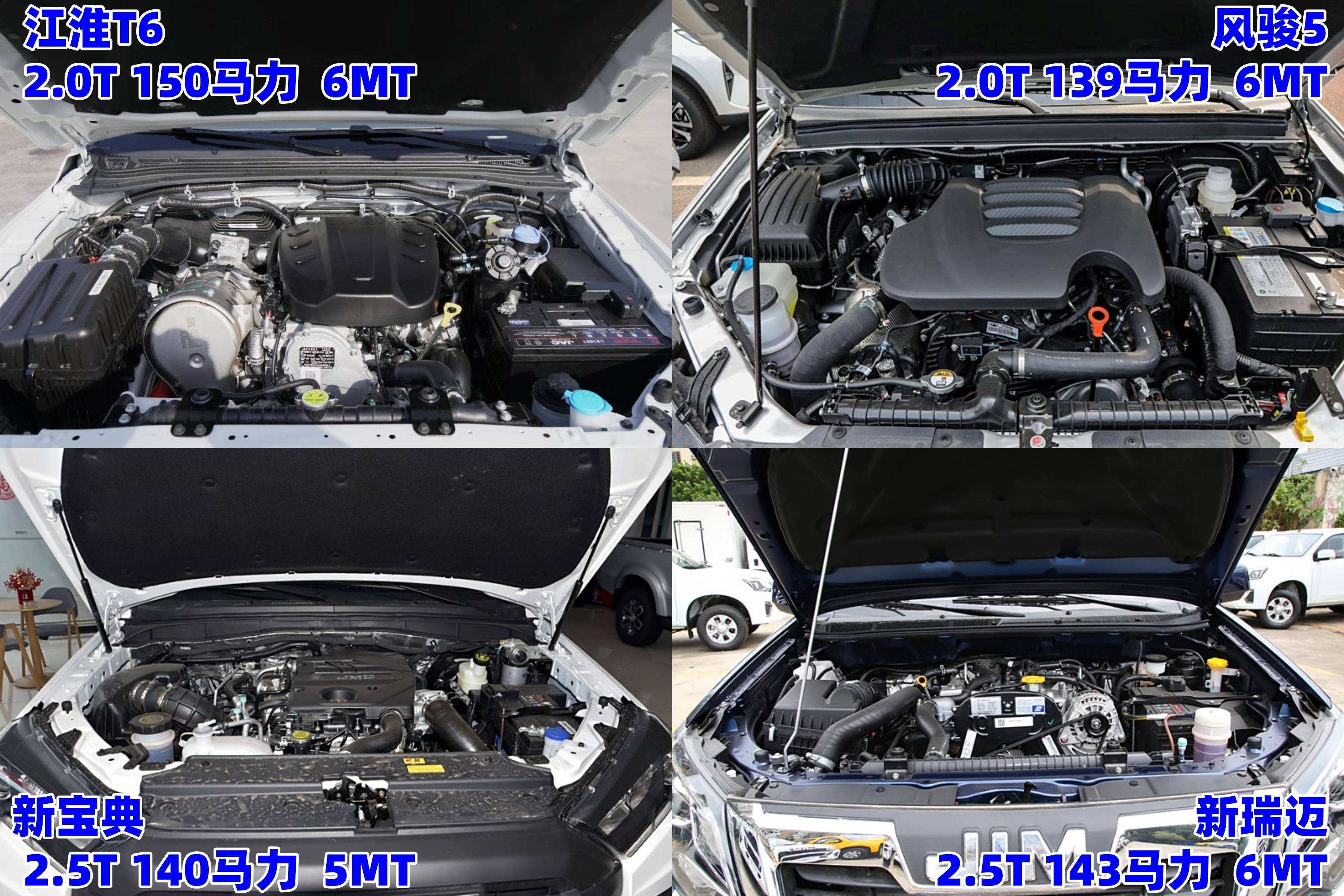 说一千道一万,商用皮卡的动力必须强!其中,江淮T6和长城风骏5搭载的是柴油2.0T发动机,江铃新宝典和江西五十铃新瑞迈搭载的柴油2.5T发动机。同排量下,江淮T6优于长城风骏5;不同排量对比之下,江淮T6也是No.1。
