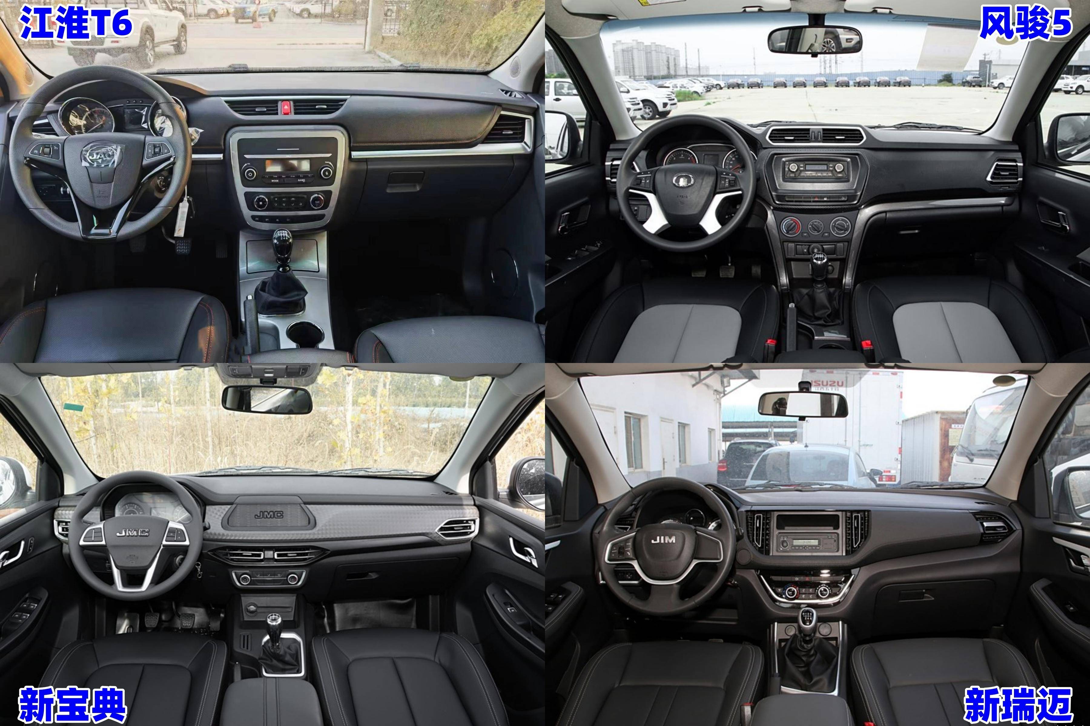 国人买车,首先看“眼缘”。虽然是商用皮卡,但颜值必须过关。整体来看,江淮T6更加时尚,硬派越野式竖格栅格外显眼,江铃新宝典次之,而长城风骏5、江西五十铃新瑞迈的“工具感”更强一些,质感明显落后一截。