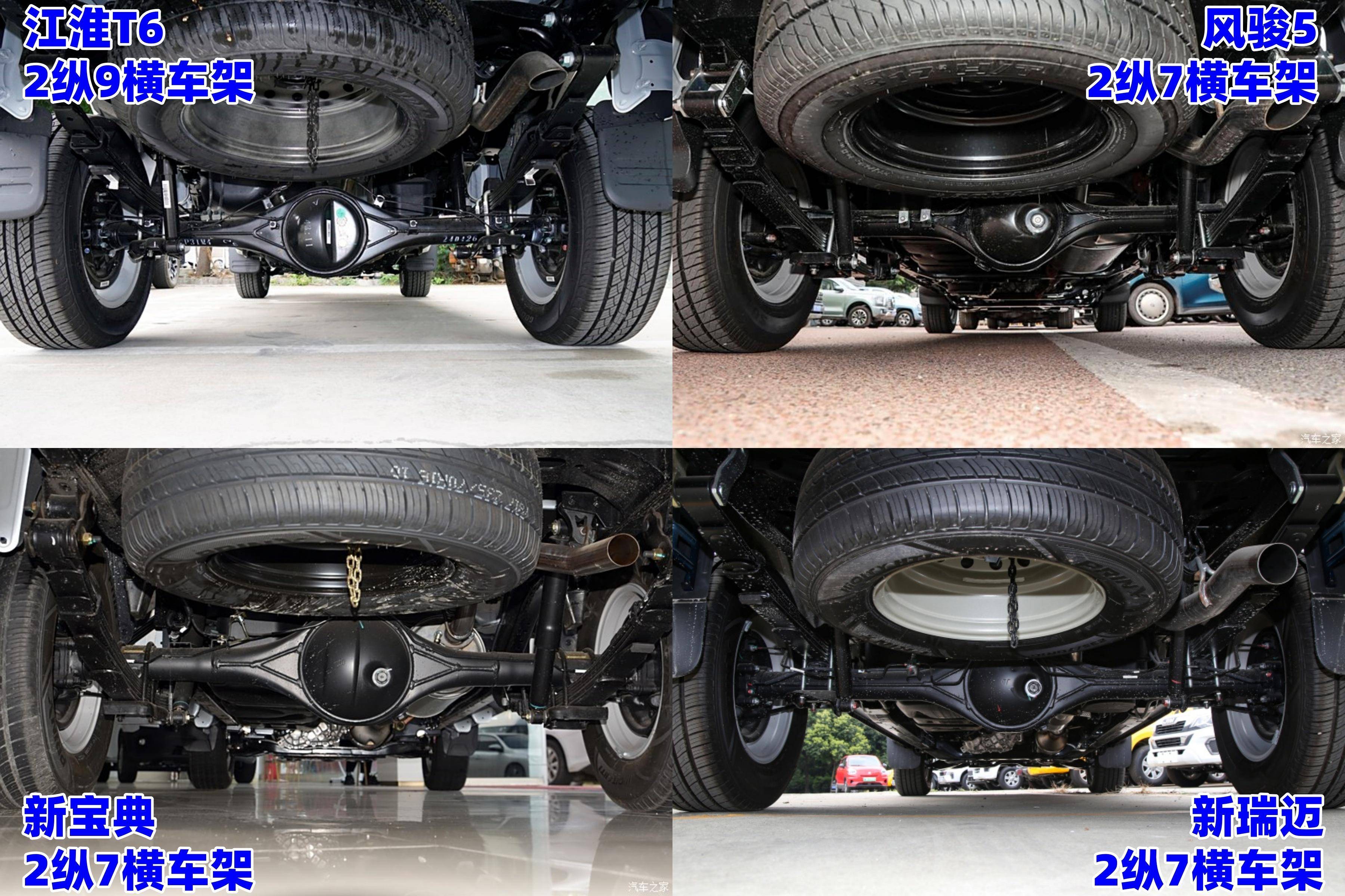 商用皮卡,底盘性能要过硬。作为对比,江淮T6拥有行业独有的2纵梁+9横梁车架,硬派越野专业底盘,车架横梁数量多,整体抗扭曲性能更优越,而其他3款的车架均为2纵7横结构。毫无疑问,江淮T6的车架实力更胜一筹。