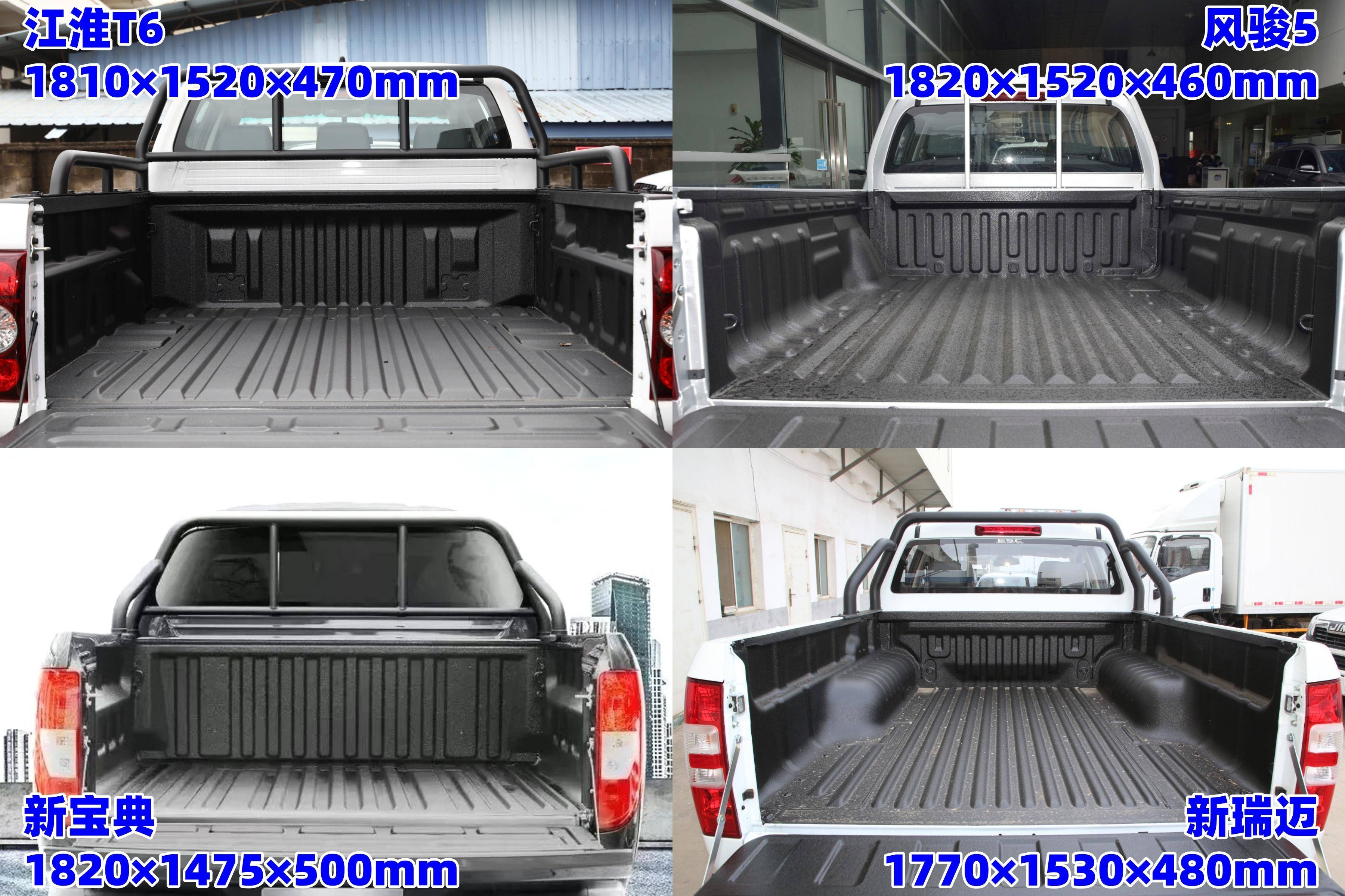 对于商用皮卡来说,空间是选车的重要因素。这4款皮卡的“块头”都比较大,江淮T6、江铃新宝典和江西五十铃新瑞迈的车长均超过了5.6米,江淮T6和长城风骏5的车高都超过1.8米。