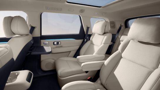 满足家庭对空间和舒适性的需求,零跑C16采用“2+2+2”六座布局,长宽高分别为4915/1905/1770mm,轴距为2825mm,已经达到大中型SUV尺寸,前后排座椅都有加热/通风,第二排还配有小桌板,靠背可实现145°的躺姿,第三排座椅整体横向宽度达到了1036mm,地台高度达到了350mm,远超同级别车型,告别小板凳式的局促感。