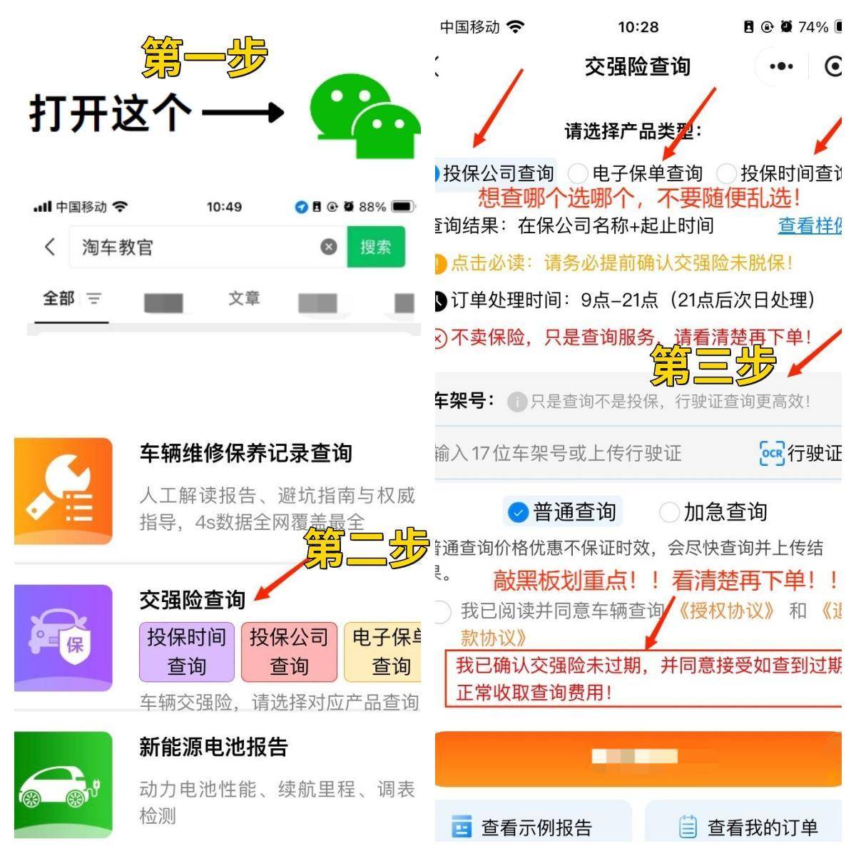 一些第三方手机软件有了交强险查询功能,例如微 信小程序“淘车教官”,您可以在小程序中通过输入车架号或上传行驶证照片来查询交强险的投保时间、投保公司和电子保单等信息。