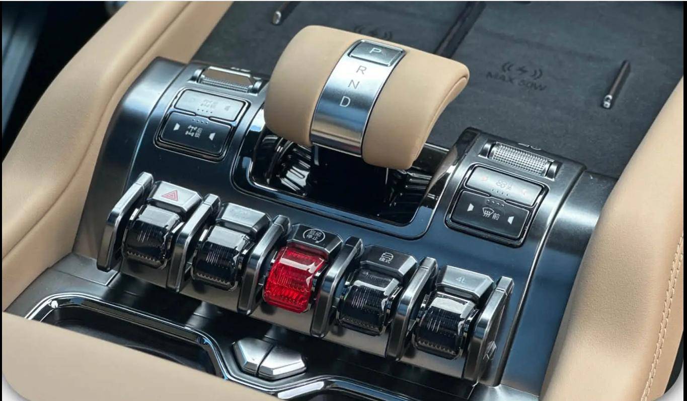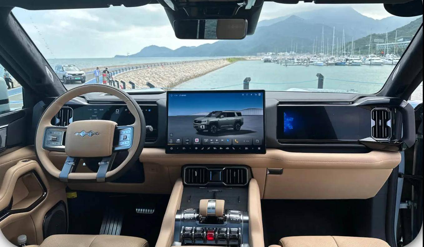 豹8的内饰设计豪华且充满科技感。车内大量使用软性材料,实体按键大块方方正正,副驾驶前方的拉手增添硬派气息。三屏设计(12.3英寸仪表盘+15.4英寸中控屏+12.3英寸副驾娱乐屏)提升了驾驶体验,内置byd9000高算力芯片,响应速度快,UI设计精美。