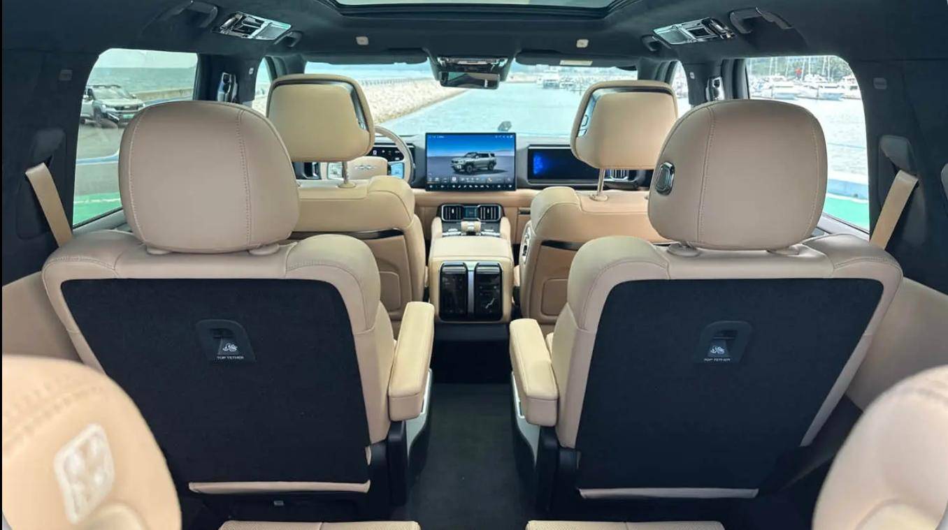 豹8采用三排座椅布局,提供6/7座两种选择。座椅宽大舒适,填充物厚实,支持电动调节。后排地板平整,进出第三排方便。第三排配备充电口、杯架等,满足后排乘客的便利性需求。