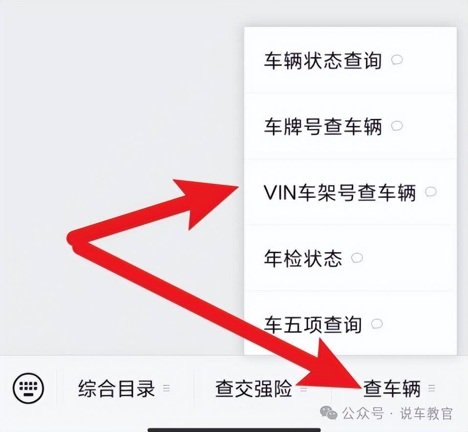 操作步骤:打开微,信,搜索“说 车教官”,关注后进入消息框。点击菜单栏的“车架号查车辆”,输入17位车架号,一键查询就搞定!