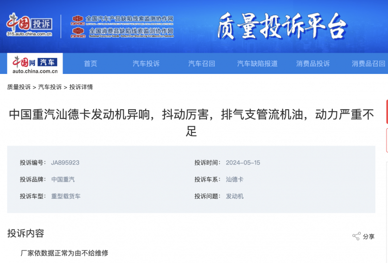 不仅是质量问题屡见不鲜,中国重汽的售后服务投诉也层出不穷。