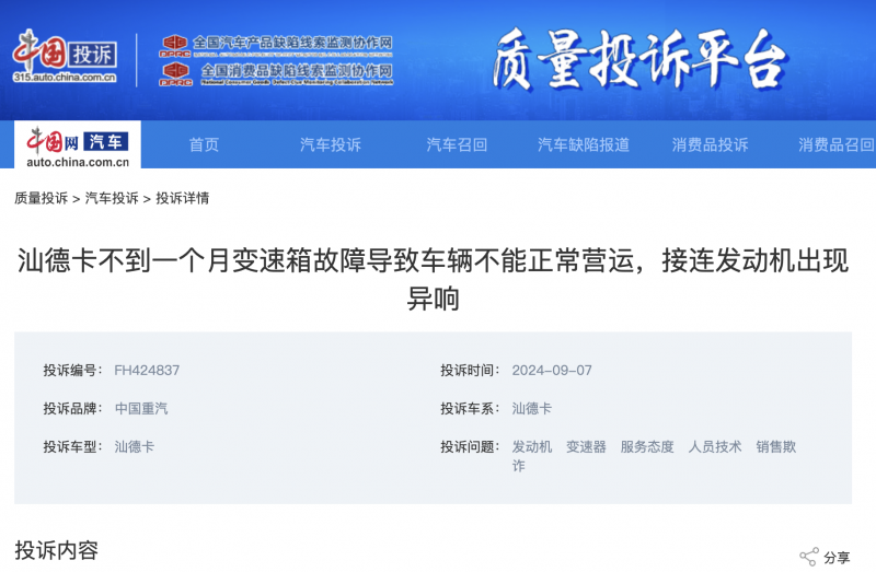 近年来,中国重汽多次因质量问题面临消费者投诉,无论是品质,还是售后服务,问题频频浮现。
