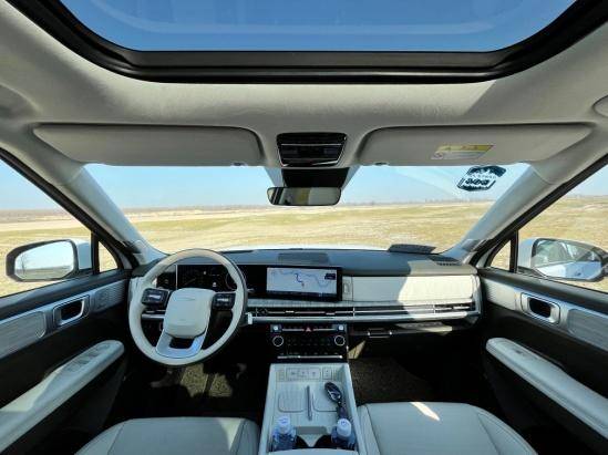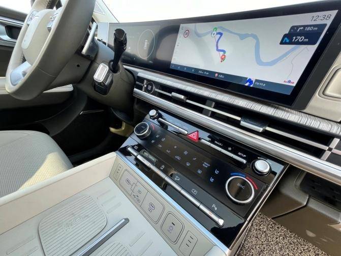 坐进第五代胜达,首先映入眼帘的是双12.3英寸全景曲面屏,科技感很强,而且内饰整体格调尽显高格调。