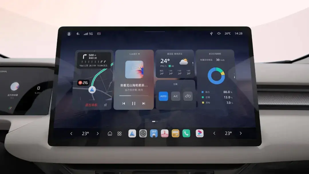 中控台配备10.25英寸的液晶仪表和15.6英寸的悬浮式中控屏,内置高通骁龙8155芯片和全新一代斑马洛神智能座舱系统,支持智能分屏功能,并配备了连续语音指令的语音助手,可实现90秒连续对话,无需唤醒。