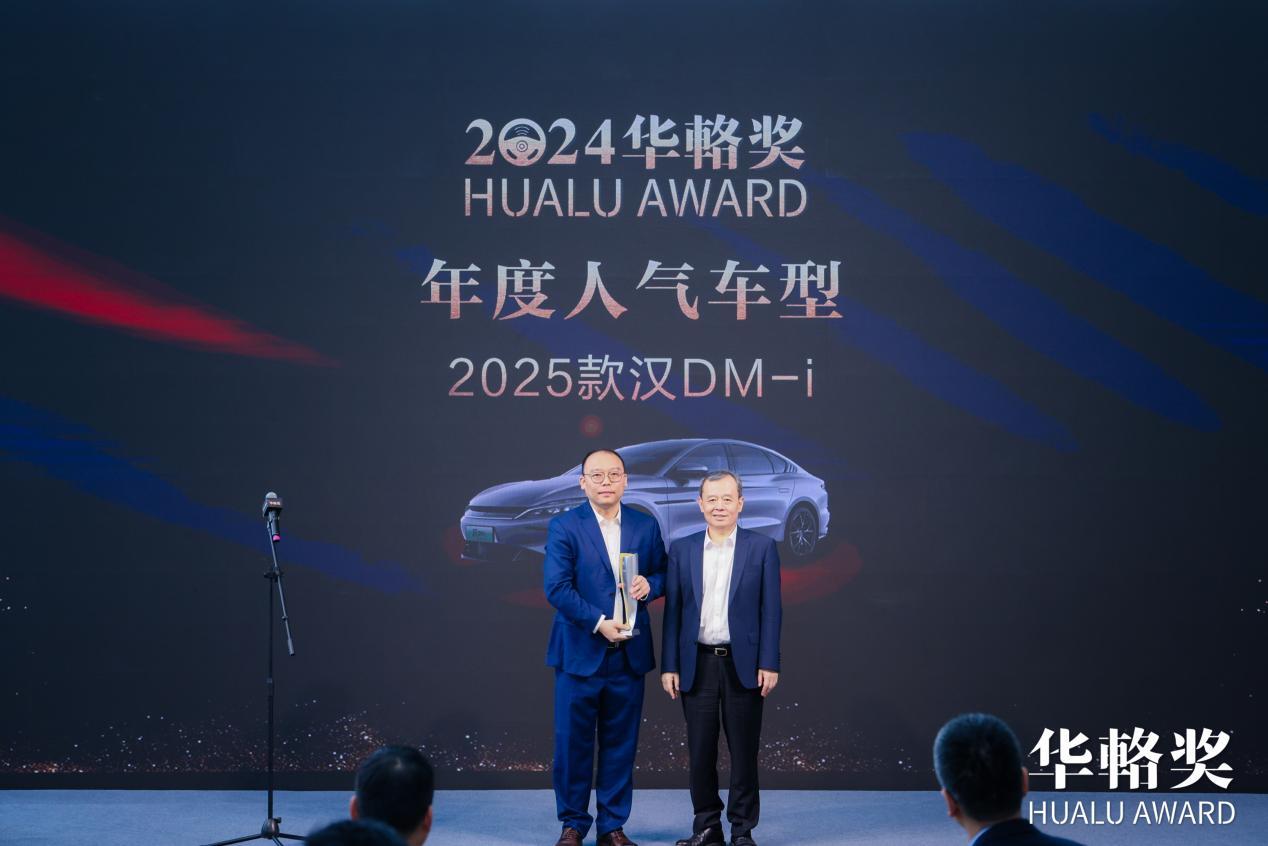 中国国际贸促会汽车行业委员会会长、中国国际商会汽车行业商会会长王侠(右)为比亚迪王朝网销售事业部副总经理汪青峰(左)颁奖