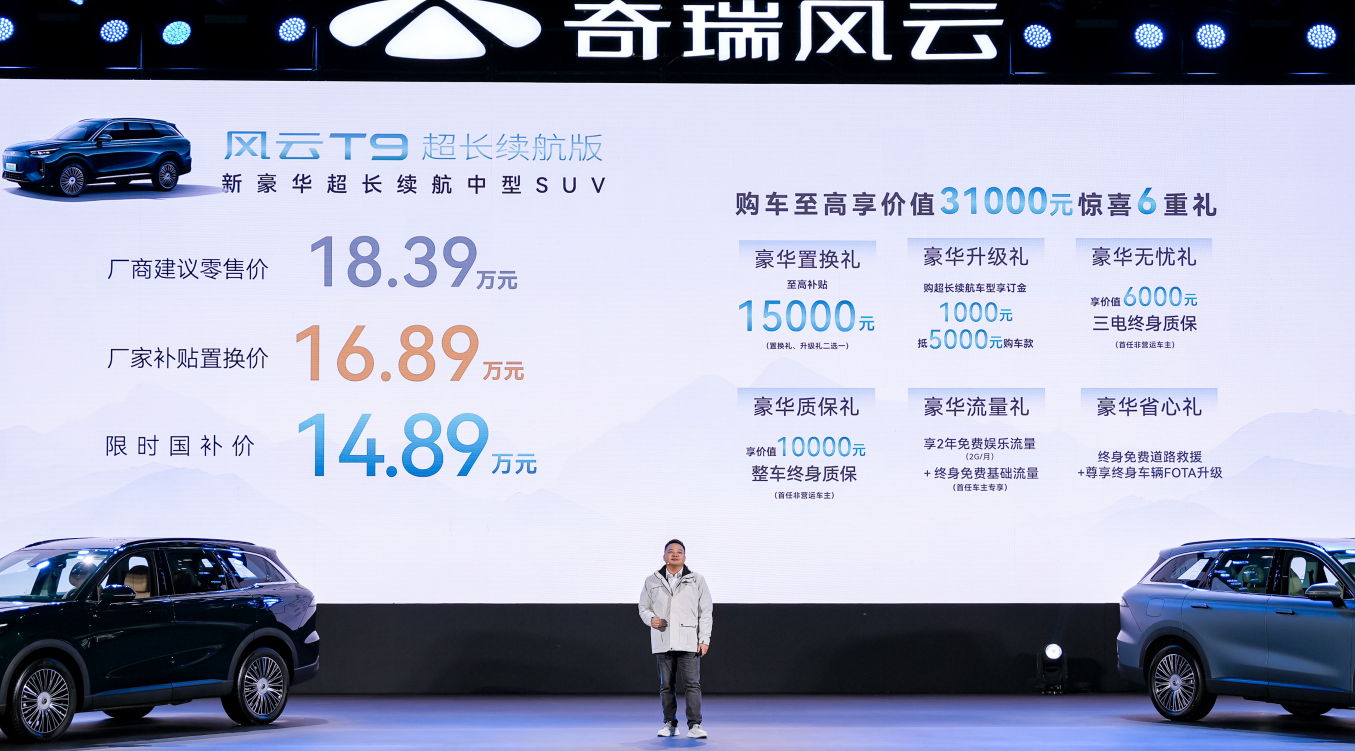 11月18日,奇瑞风云T9超长续航版车型正式上市。该车型仅推出一款配置,官方指导价为18.39万元人民币,而国家补贴后的限时售价为14.89万元人民币。
