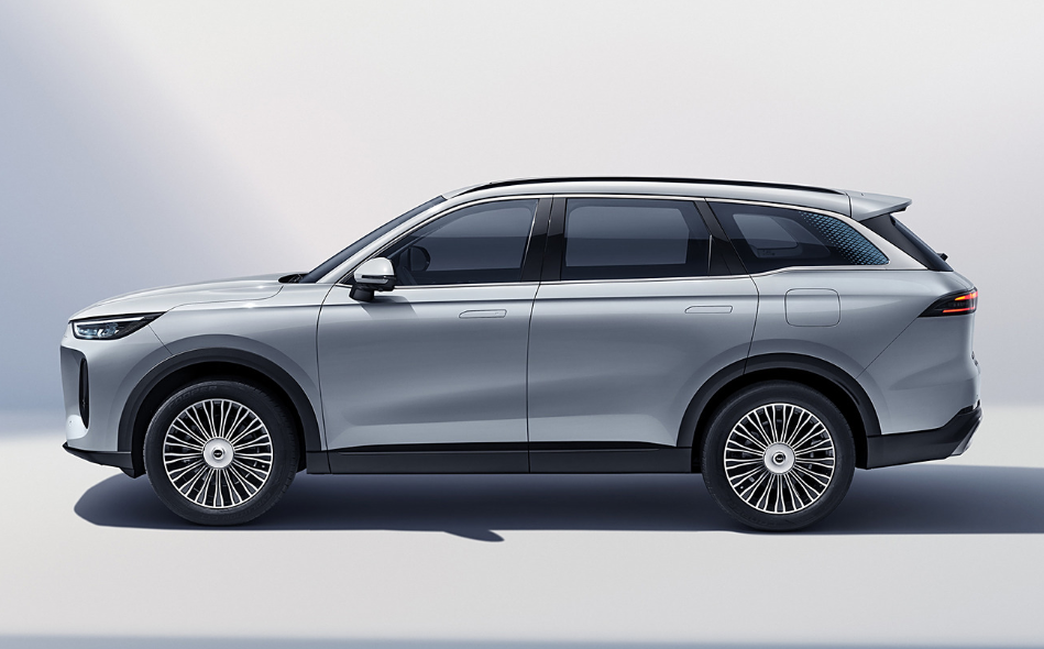 新车的车身侧面设计呈现出一种流畅而宽敞的视觉效果,其腰线设计从车头延伸至车尾,赋予了车身一种更加修长的轮廓。车辆配备了隐藏式门把手和大尺寸密条辐式轮毂,这些设计元素共同作用,营造出一种大型车辆的庄重感。此外,新车在B柱和D柱之间的玻璃面积较大,D柱部分采用了渐变风格花纹块进行装饰,这不仅丰富了新能源车型的设计元素,也为车辆增添了一抹现代感。第三排侧窗的面积设计得较为宽敞,确保了第三排乘客在车内能够享受到较为开阔的视野,减少了乘坐时的压抑感。