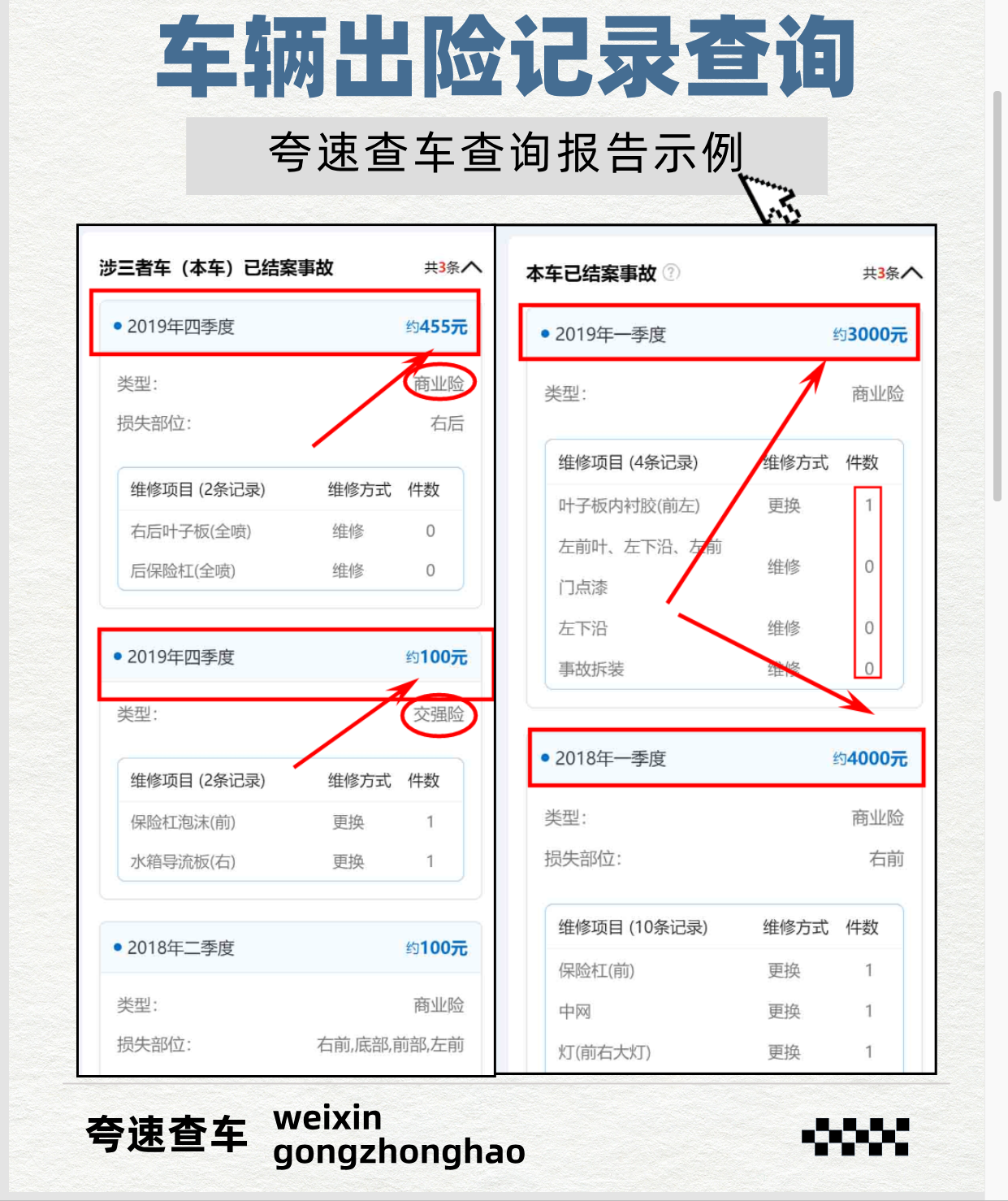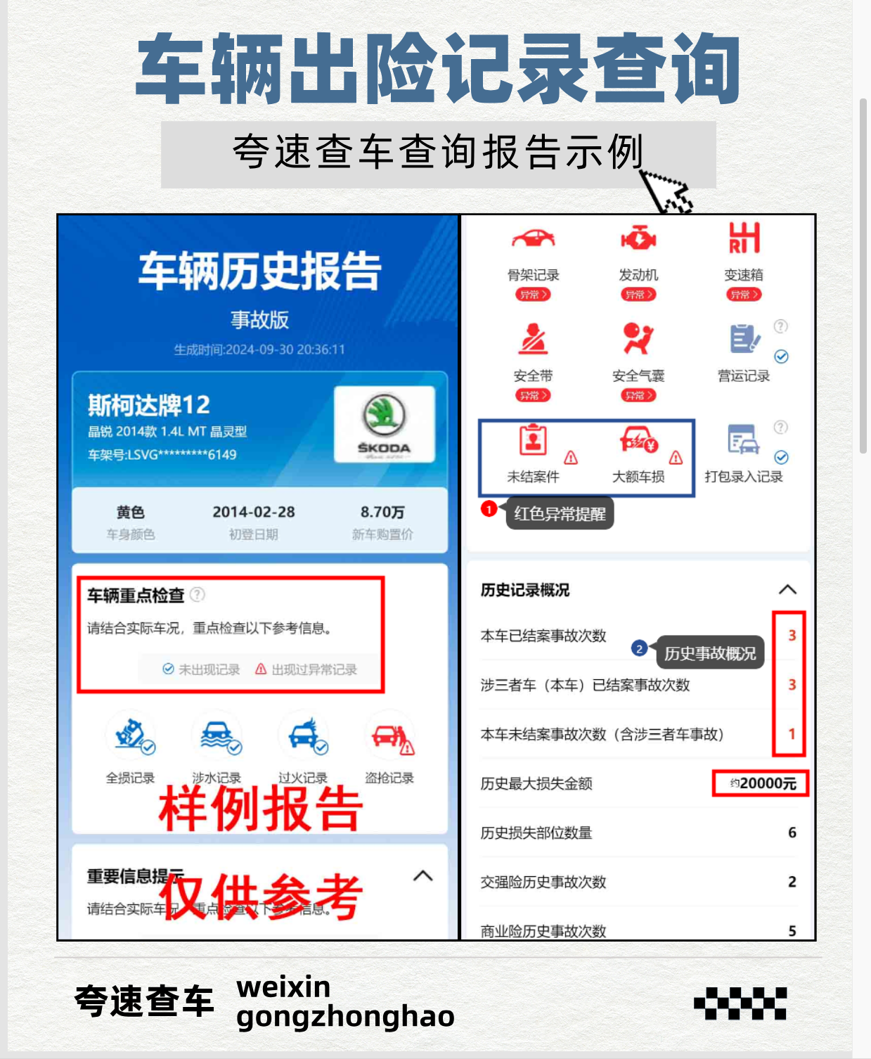 现在有不少专业的第三方汽车服务平台提供车辆事故记录查询服务,车主只需输入车架号或上传行.驶证,即可获取详细的事故记录。比如夸♥速查车这样的平台,收集整合来自多方的数据,包括但不限于保险公司、4S店等。打开维♥,进入夸♥速查车的工种♥号主页,点菜单栏第一列第一行。根据页面提示,输入车辆车架号,即可查询。
