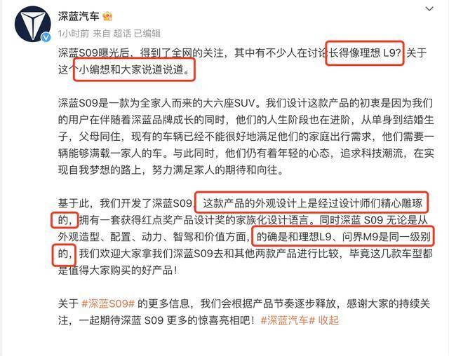 对此深蓝汽车也是进行了官方回应!深蓝解释说:“外观设计经过了精心雕琢,的确是与理想L9,问界M9同级别。”