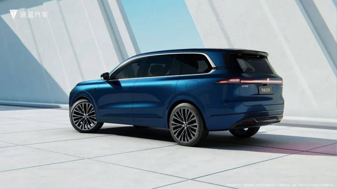 除了长安启源,深蓝也带来了一款大尺寸SUV。深蓝S09作为深蓝汽车的首款大尺寸SUV车型,新车在设计上全面融入了深蓝“共生美学”设计理念,前脸采用了深蓝家族式鲨鱼鼻设计,一体贯穿式深蓝星环大灯与星河霓虹贯穿式尾灯相呼应,展现出强烈的科技感。车身尺寸方面,深蓝S09和理想L9属于同级车型,长、宽、高分别为5205/1996/1800mm,轴距达到3105mm。这样的尺寸使得新车在空间上拥有很大的优势,车内采用2+2+2的座椅布局,成为深蓝汽车首款大六座SUV。