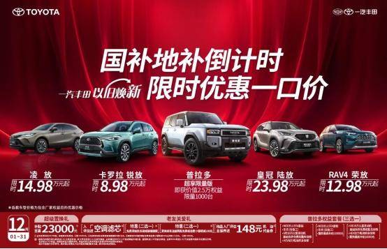 以全新普拉多为引领的这场跨越百城、汇聚万人的英雄盛会,包含皇冠陆放、RAV4荣放、HARRIER凌放、卡罗拉锐放在内的一汽丰田SUV家族集结,正带来精彩的年度收官之旅。同时,一汽丰田12月专属“国补地补倒计时”岁末钜惠活动也已正式开启。