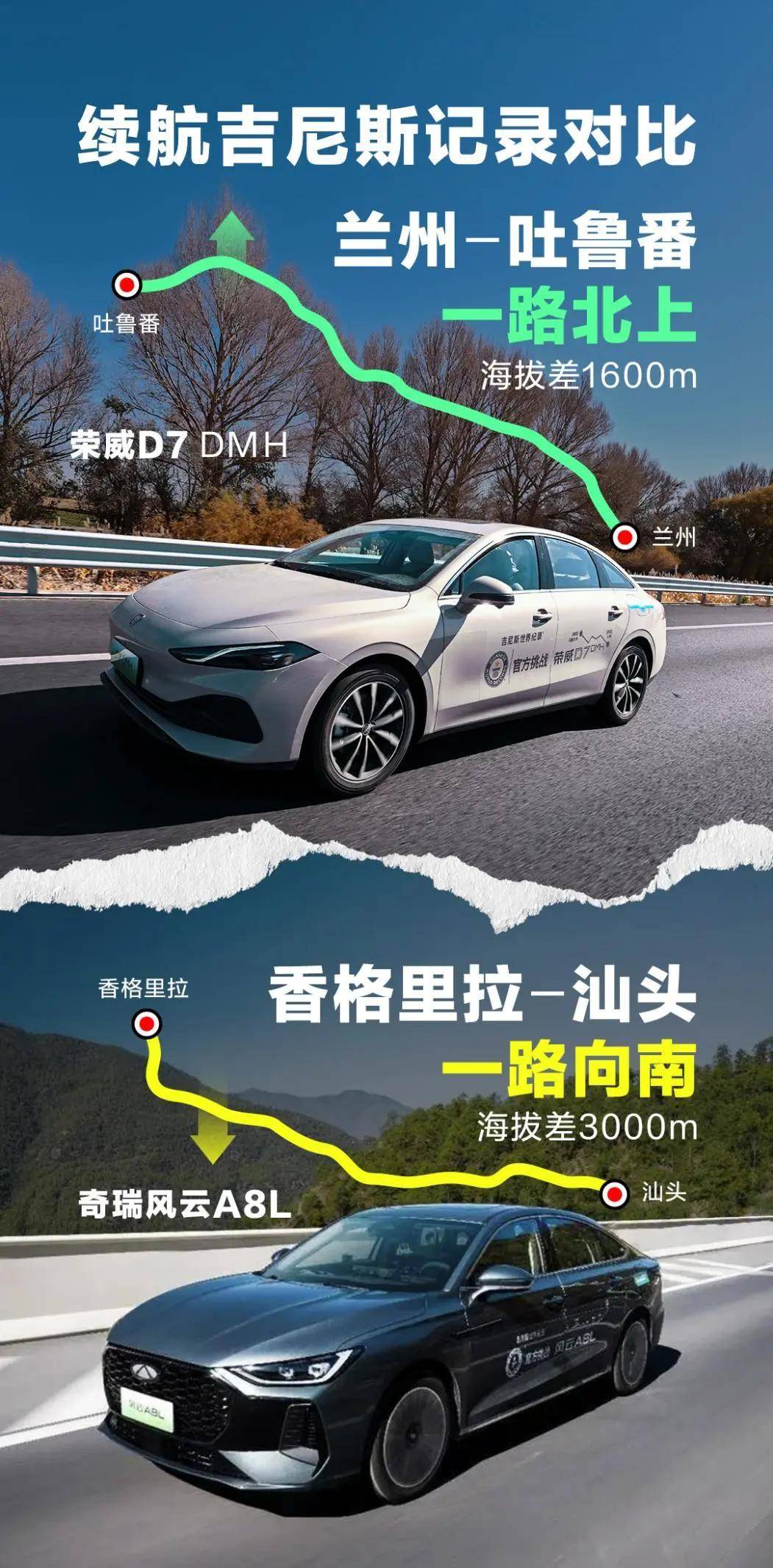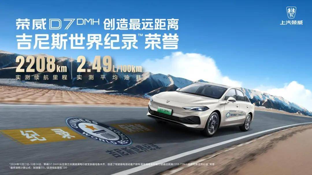 荣威D7DMH单次满油满电行驶最远距离2208.719km的吉尼斯世界纪录,是以兰州为起点,途径嘉峪关、敦煌、吐鲁番最终抵达乌鲁木齐,这一路海拔都在升高,通俗点说就是一路在高海拔地区上坡行驶,驾驶环境也很复杂覆盖戈壁滩、雪地、山地,最低温度达零下8度。