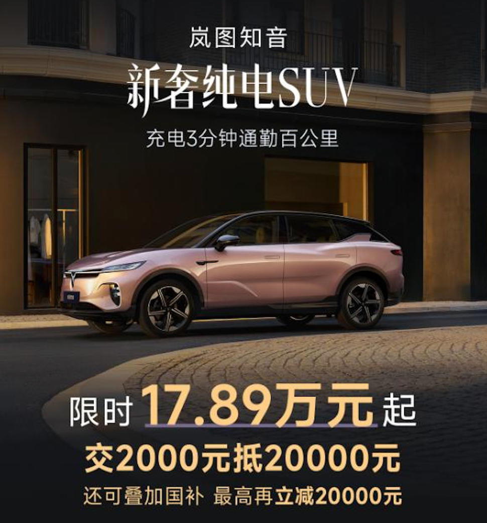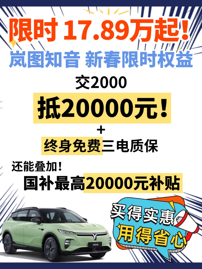 根据岚图汽车官方1月13日公布的全新政策,2025年1月13日-1月31日下定岚图知音的用户,2000元抵20000元,相当于现金立减18000元。在此基础上,岚图知音官方还推出包括终身三电质保的三大购车好礼。