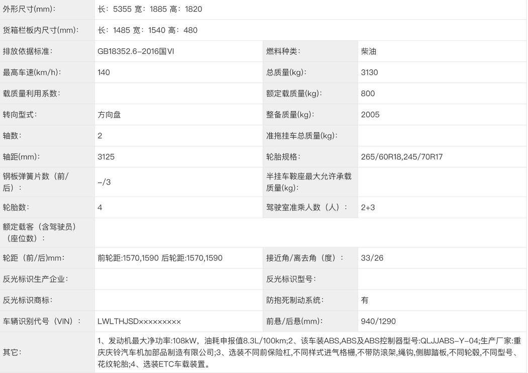车身侧面部分,与现款差别不大,车窗外侧部分加入熏黑饰条。车身尺寸方面,新车标轴版的长宽高分别为5355/1885/1820毫米,轴距为3125毫米,其中货箱的长宽高分别为1485/1540/480毫米。长轴版主要是车长和轴距分别增加了310毫米,货箱为长度加长315毫米。