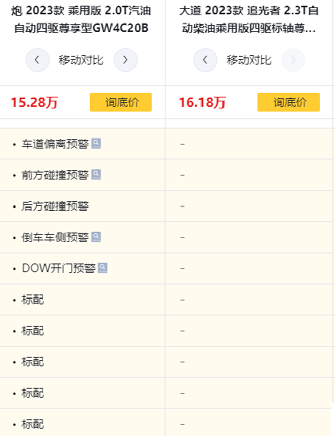 不仅是动力数据上的差异,在驾驶成本这块,猎手也是毫无疑问的胜利。养一台皮卡车的最大成本就是油耗,话说,只是每年的汽油或者柴油费用就足以让你头疼了。大道的百公里油耗普遍在十几个左右,而猎手的百公里油耗低至1.3L。一年下来长安猎手就要比江铃大道省下不少钱。其次,我们从配置方面来说,江铃大道也并没有占明显优势。江铃大道追光者2.3T自动柴油乘用版四驱标轴尊享版的指导价格到了16.18万元,这个价格却并没有配备车道偏离预警、前方碰撞预警、后方碰撞预警、倒车车侧预警等主动安全预警配置,这些在指导价格15.98万元的长城炮2.0T自动尊享版上都具备。再者长城炮还多了360°全景影像、自动泊车,方向盘换挡,内置行车记录仪等一些实用性很强的配置。
