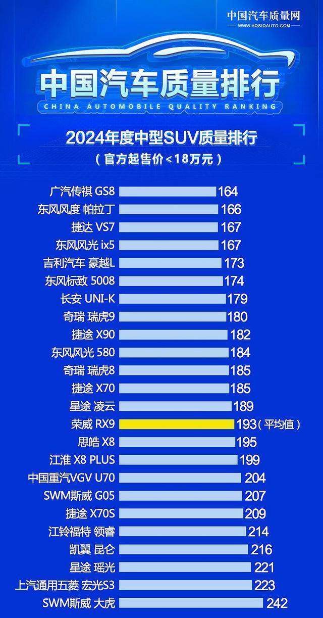 看到这里,消费者心目中疑问可能又来了,什么样的中型SUV车型质量更好?关于这一点,不妨参考中型SUV质量测评报告。日前,中国汽车质量网发布2024年度中型SUV质量排行(官方起售价<18万元),共有24款车型参与评选,接下来,看看哪些车型是品质“高手”?