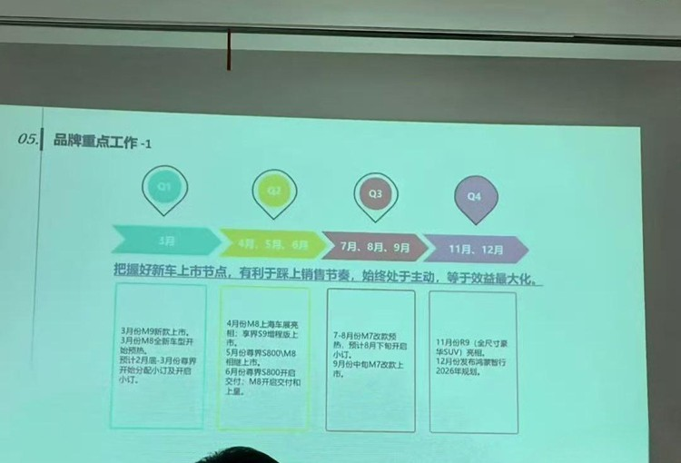 从车型规划时间来看,新款M9将于3月份上市;享界S9增程版将于4月上市;尊界S800将于5月底粤港澳车展上市,6月交付;问界M8 4月上海车展首发亮相,5月上市,6月交付;新款问界M7 8月下旬开启小订,9月中旬上市;智能R9将在今年11月正式亮相。