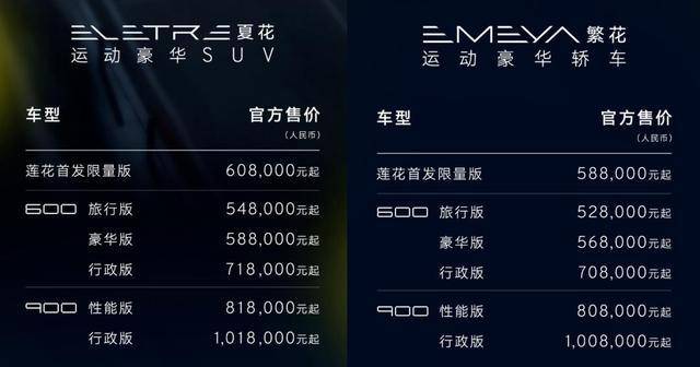 现在,ELETRE 的售价区间是 54.8-101.8 万, EMEYA 的售价区间是 52.8-100.8 万。