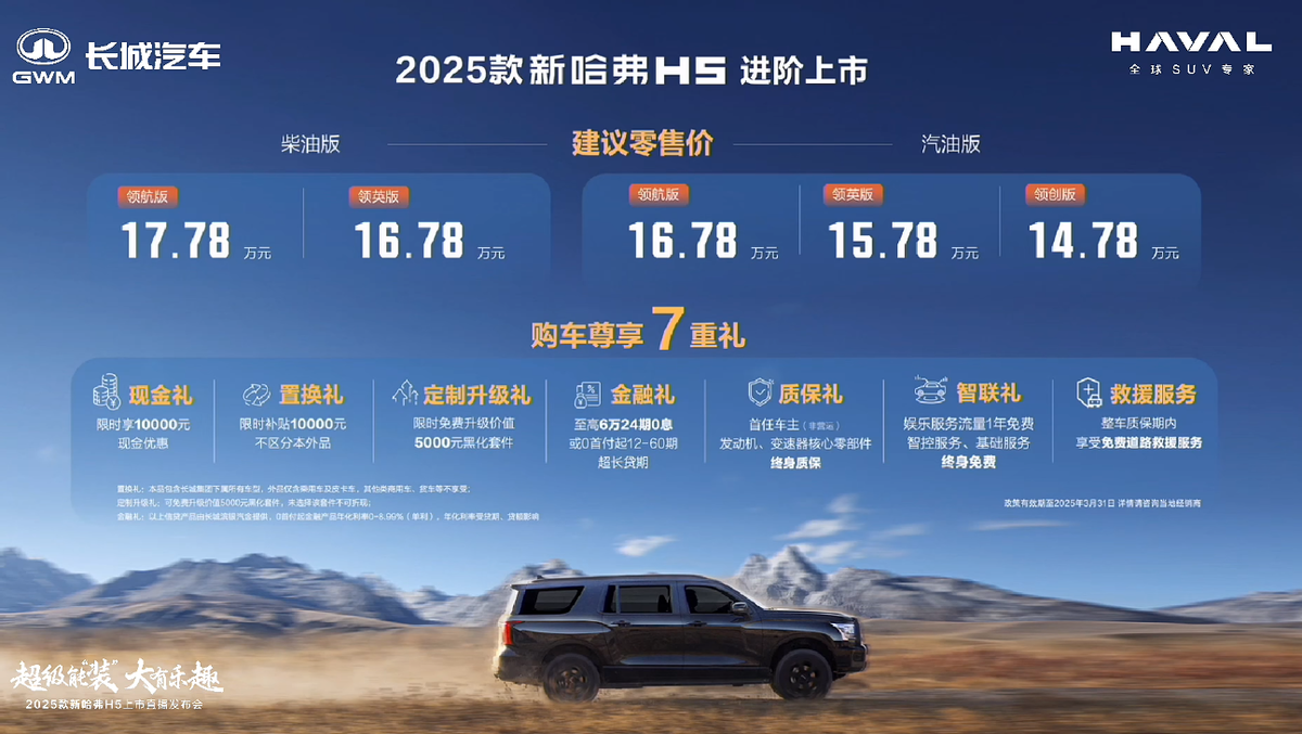 3月13日,2025款新哈弗H5正式上市,指导价:14.78万--17.78万元。