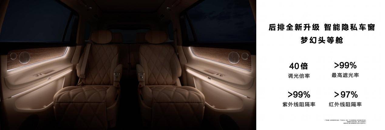问界M9两侧后排升级智能隐私车窗[6],4档透光度可调,支持门板物理旋钮、语音等多种调节方式,实现看得见风景,守得住隐私的领先体验。创新暮夜空间,关闭遮阳帘、车窗,智能隐私车窗调至最暗、打开幕布,关闭氛围灯、阅读灯,一键进入隐私、休憩时刻。
