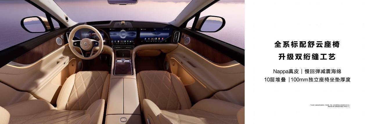 问界M9全系标配舒云座椅,采用优质Nappa真皮,升级双绗缝工艺,奢适触感与豪华质感相得益彰。主驾座椅升级电动可伸缩坐垫,大五座二排可选奢享零重力座椅套装[9],新增物理按键,支持一键即享,享六座主驾二排座椅升级电动腿托,坐拥奢适舒享体验。