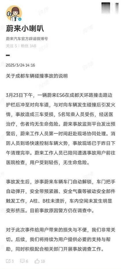 来自“蔚来小喇叭”的蔚来汽车官方微博账号发布了“关于成都车辆碰撞事故的说明”,除了叙述事故经过外,蔚来汽车重点说明了事故发生后,涉事蔚来车辆车门自动解锁,车门把手自动弹开,安全带预紧器、安全气囊等被动安全部件触发工作,A柱、B柱未溃折,车内空间未发生明显变形挤压,目前事故原因警方仍在调查中。
