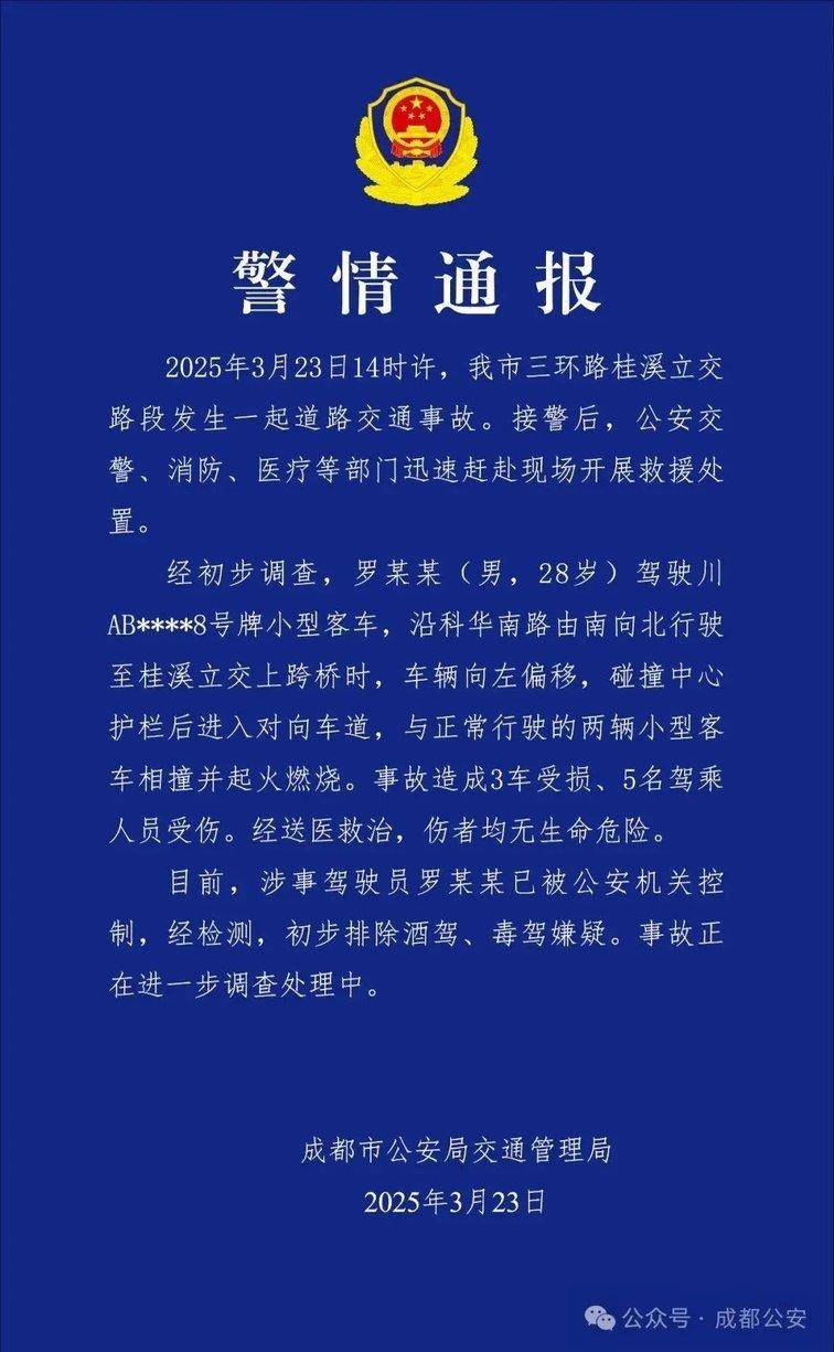 事故发生后,成都公安也第一时间公布了“警情通报”,初步排除酒驾、毒驾嫌疑,事故正在调查处理中。