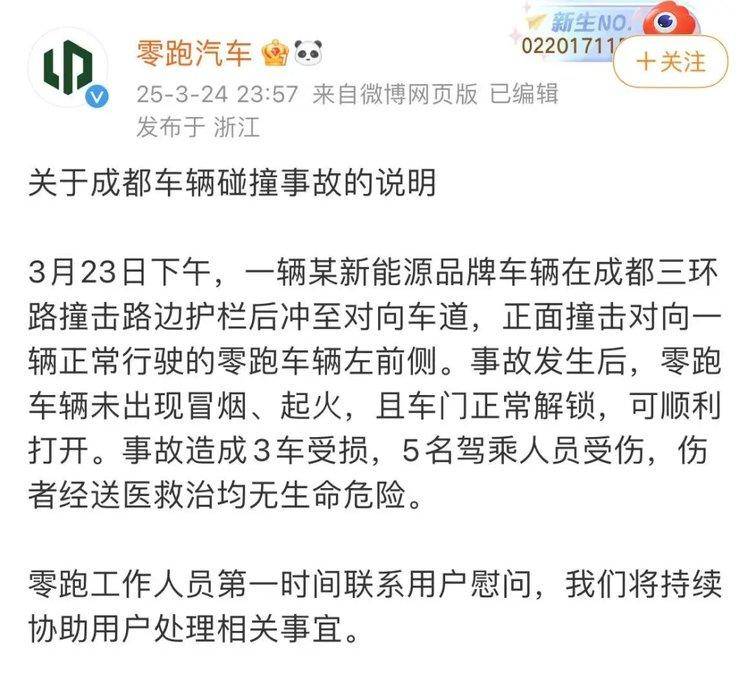 零跑汽车也在3月24日发布了“关于成都车辆碰撞事故的说明”,重点说明了事故发生后,零跑车辆未出现冒烟、起火,且车门正常解锁,可顺利打开。