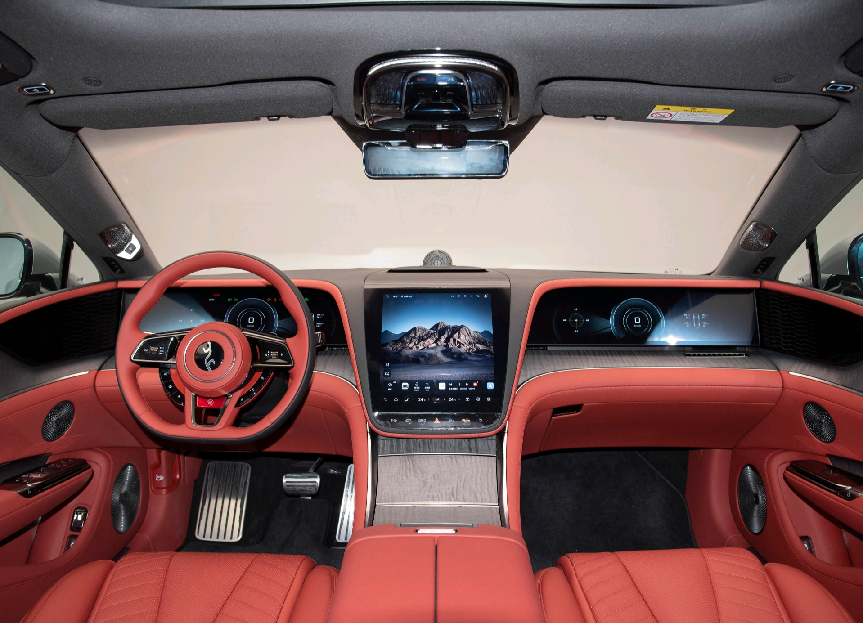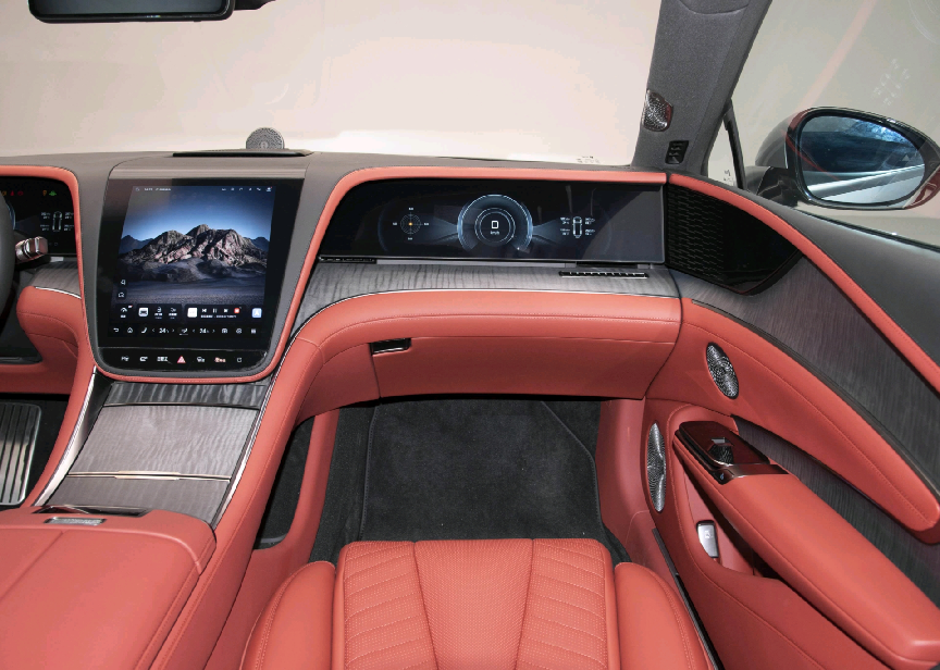 相对于炫酷的外观,内饰设计并没有太过激进,整体的布局和仰望U8有相似之处,体现出比亚迪理解的另类的豪华。车内根据云锦红、珠缎白两种不同的内饰配色,大量采用了实木饰板、碳纤维饰板,来营造基于豪华的运动感。仰望U7的智能座舱,采用了4纳米(口误)芯片,并搭载新一代的DiLink智能网联系统,在人机交互显示界面方面,也有不同的方案。