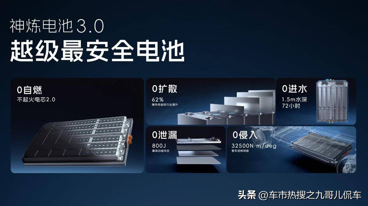 神炼电池3.0通过不起火电芯、五横七纵结构设计、CTC电池一体化、神菱盾、神菱甲等技术,达成“0自燃、0扩散、0进水、0侵入、0泄漏”的“五零安全”。