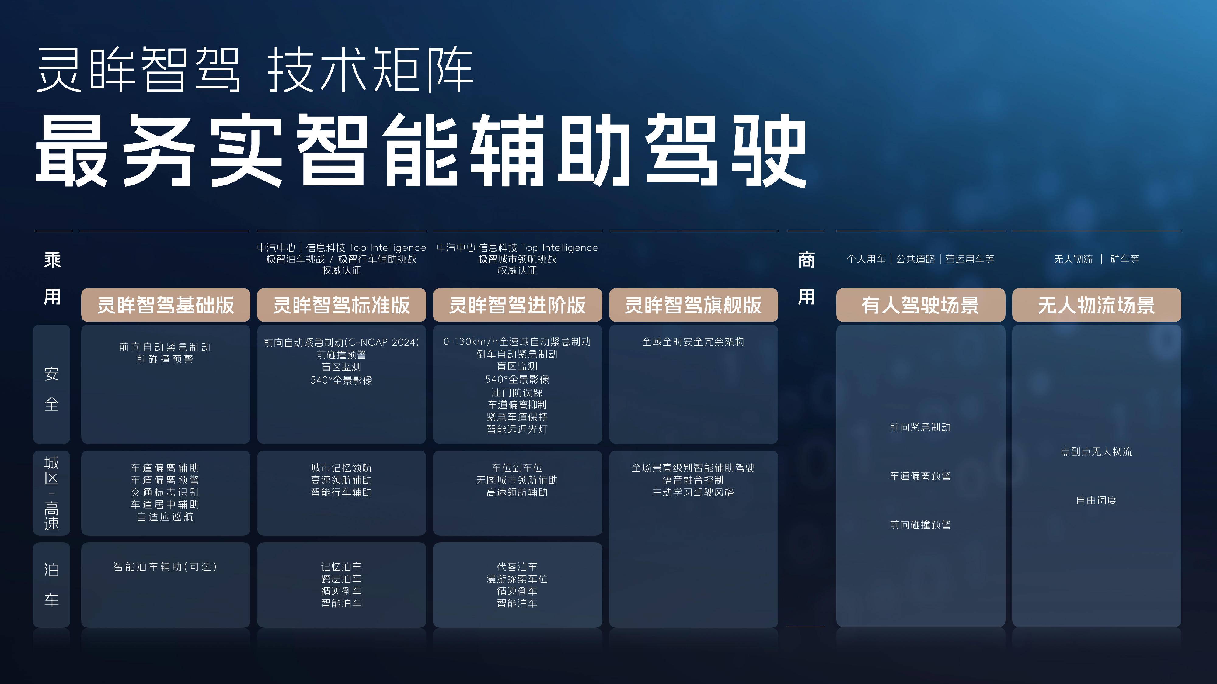 灵眸智驾技术矩阵基于两段式端到端架构、可解释端到端架构和⽣成式世界模型的不同进化路线,五菱为灵眸智驾技术矩阵规划了基础版、标准版、进阶版和旗舰版四大层级,在城区、高速、泊车的不同场景上——在宣传上,五菱强调智驾技术坚持以安全为先,这也是对近几年来消费者对于“智驾”安全关切的及时回应。