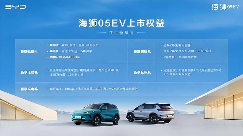 海狮05 EV车型的亮点多多,8大亮点以超越同级的优势成为当下热度极高的车型,具体来看:1.平台架构:基于基于e平台3.0 Evo打造,采用后置后驱布局,前麦弗逊式后五连杆式独立悬架;2.产品定位:定位紧凑型纯电SUV,其长宽高分别为4520/1860/1630mm,轴距为2720mm;3.外观造型:采用比亚迪海洋美学设计,造型风格简约时尚,提供暖阳白、沐川青、海域白、钧窑灰共4款配色可选;4.内饰座舱:采用12.8英寸中控屏和8.8英寸数字仪表组合,搭配怀挡式换挡,搭载智能座舱高阶版-DiLink 100,内置6nm制程芯片,支持四区域全场家语音系统、3D控车、定制导航、哨兵模式、千里眼等;5.智能驾驶:搭载天神之眼C-高阶智驾三目版(DiPilot 100),配备由5颗毫米波雷达,12颗超声波雷达、12颗前后向与侧向视觉感知高清摄像头组成高感知系统,支持高快领航、拨杆变道、智能泊车、前方后碰撞预警、主动刹车等功能;6.豪华配置:配备车载冷暖冰箱、50W手机无线充电、前排座椅通风/加热、8扬声器音响系统、全景天幕、电动遮阳帘、电容式方向盘、后排空调出风口等;7.动力:全系采用单电机驱动,最大功率分别为140千瓦和160千瓦,峰值扭矩均为330牛·米,百公里加速时间分别为7.6秒和7.2秒,最高车速180km/h;8.续航里程:提供容量为50.05千瓦时和60.90千瓦时电池组可选,CLTC纯电续航里程分别为430km和520km,支持最大156千瓦充电功率,SOC 30%-80%仅需18分钟。新车在配置上配备有领先同级的车载冷暖冰箱、50W手机无线充电、前排座椅通风/加热、8扬声器音响系统、全景天幕、电动遮阳帘、电容式方向盘、后排空调出风口、多色氛围灯、电动后备箱等豪华配置。