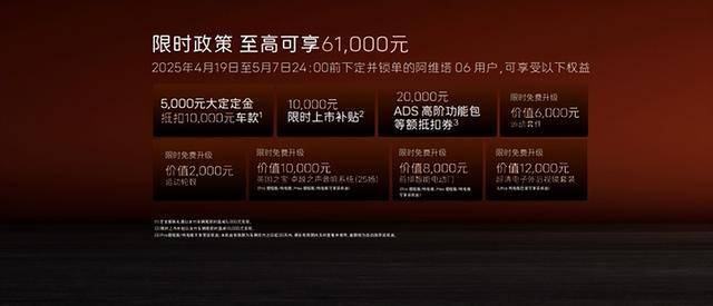 与此同时,即日起至2025年5月7日24:00,下定阿维塔06的用户可享受至高61000元的八大限时权益,包括:大定定金5,000元抵扣10000元车价,限时上市补贴10000元,价值20,000元 ADS 高阶功能包等额抵扣券,还有价值6,000元的运动套件、价值2,000元的20寸气旋五幅运动轮毂免费送,价值10,000元的25扬英国之宝·卓越之声音响系统、价值8,000元的前排智能电动门免费升级,及面向Ultra车型用户价值12,000元的超清电子外后视镜套装限时免费升级。