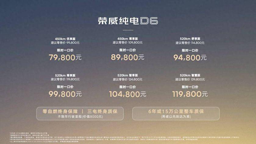 在新能源汽车市场竞争愈发激烈的当下,荣威纯电 D6 的登场,宛如一颗重磅炸弹,掀起了 A + 级轿车市场的波澜。尤其是7.98 万起的限时一口价,使其快速切入 A+ 级轿车赛道。搭配行业领先的 “零自燃保障” 和 “三电终身质保” 双重权益,荣威纯电 D6 以极具诚意的姿态,向消费者展示着技术普惠的决心。