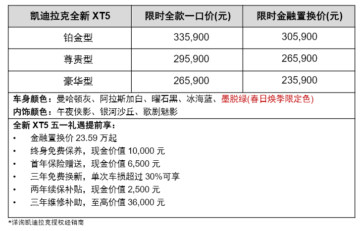 (2025年4月24日)凯迪拉克品牌宣布,全新XT5春日焕季版正式上市,限时全款一口价26.59万元起,购车即可尊享春日焕季限定色——墨脱绿。同时,全新XT5春日焕季版将延续23.59万起金融置换价,还可“五一礼遇提前享”,包含终身免保养、首年保险赠送、三年免费换新等在内,价值超50,000元的专属增值权益,让消费者拥车终身无忧,畅享全路况自由。