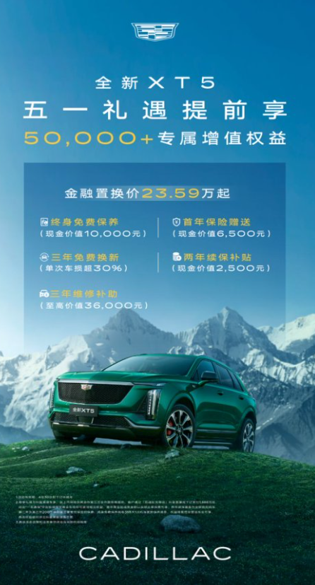 没有后顾之忧的自由,才是真自由。性能卓越的同时,凯迪拉克更将全新XT5春日焕季版的权益拉满。针对有分期购车需求的消费者,凯迪拉克提供23.59万起金融置换价,让用户畅享自由豪华不设限。即日起至4月30日前下订并提车,可提前锁定全新XT5“五一礼遇”,包含终身免费保养、首年保险赠送、三年免费换新等购车权益,“养车包到底,小修有补贴,大修换新车”,你只管踩油门,凯迪拉克将全程为你的每一次出行保驾护航。让消费者尊享购车无忧、用车无忧、保值无忧、出行无忧的全生命周期豪华体验。