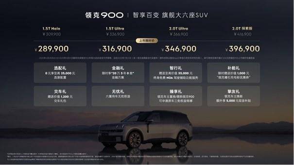【中国·上海】2025年4月28日,领克汽车旗下全新旗舰力作领克900正式上市,推出1.5T Halo、1.5T Ultra、2.0T Ultra 、2.0T探索版四大配置,限时售价28.99万元至39.69万元。