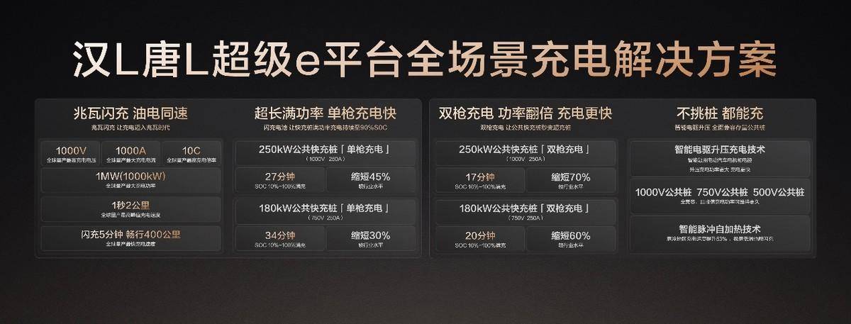 其中,凭借超级e平台全域千伏架构,汉L EV、唐L EV双车同时拿下中汽中心“兆瓦充电之星”的权威认证!新车拥有10C全球量产最大充电倍率,1000kW全球量产最大充电功率,兆瓦闪充,油电同速,闪充5分钟,畅行400km,让服务区充电从人等车变车等人!
