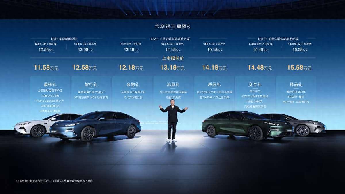 5月9日,全球新一代豪华中高级电混轿车——吉利银河星耀8正式上市。新车推出极致性能雷神EM-P 2个版型、极致节能雷神EM-i 3个版型,该5个版型标配千里浩瀚智能安全辅助驾驶;同时为满足用户对辅助智驾的自由选择需求,推出雷神EM-i 2个版型标配基础辅助驾驶。吉利银河星耀8上市限时价11.58~15.58万元(仅限2025年6月30日前,完成大定锁单的用户,可享上市限时价),同时也为用户推出丰厚的限时购车权益。