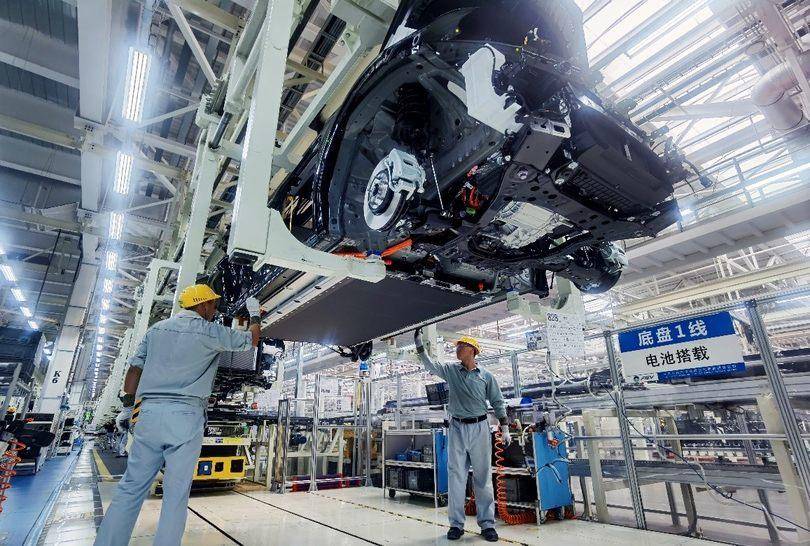 < 一汽丰田新能源工厂的生产线工人正在通过智能设备为bZ5搭载电池>
