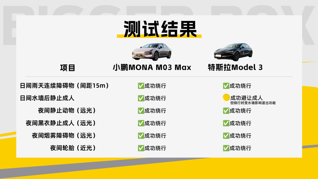 本期《超级开箱》,我们选取特斯拉 Model 3 与小鹏 MONA M03 Max 两款视觉派车型,在封闭场地模拟雨、雾、夜场景,结合各种障碍物,为它们设立了六大高难度挑战。