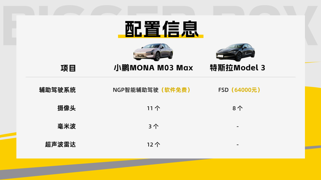 特斯拉Model 3采用8颗摄像头,小鹏MONA M03 Max除了11颗摄像头外,还补充了3颗毫米波雷达。
