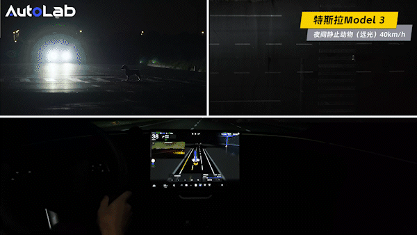 在夜间无路灯环境下,将小狗置于车道正前方。两台车的辅助驾驶速度都在40km/h左右,开了远光。